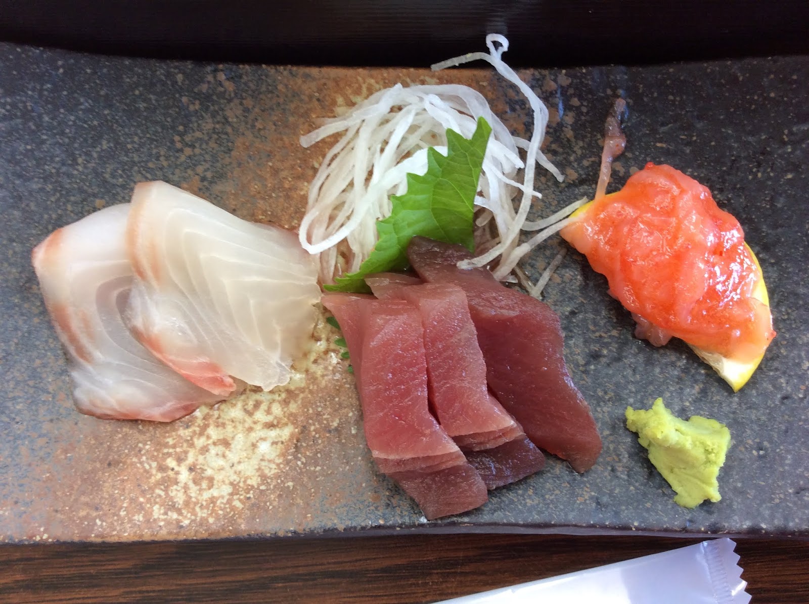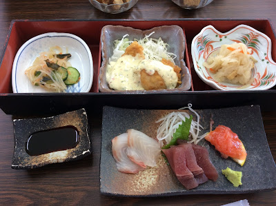 每人一套的日式海鮮風味料理,有生魚片、開胃菜、漬物、