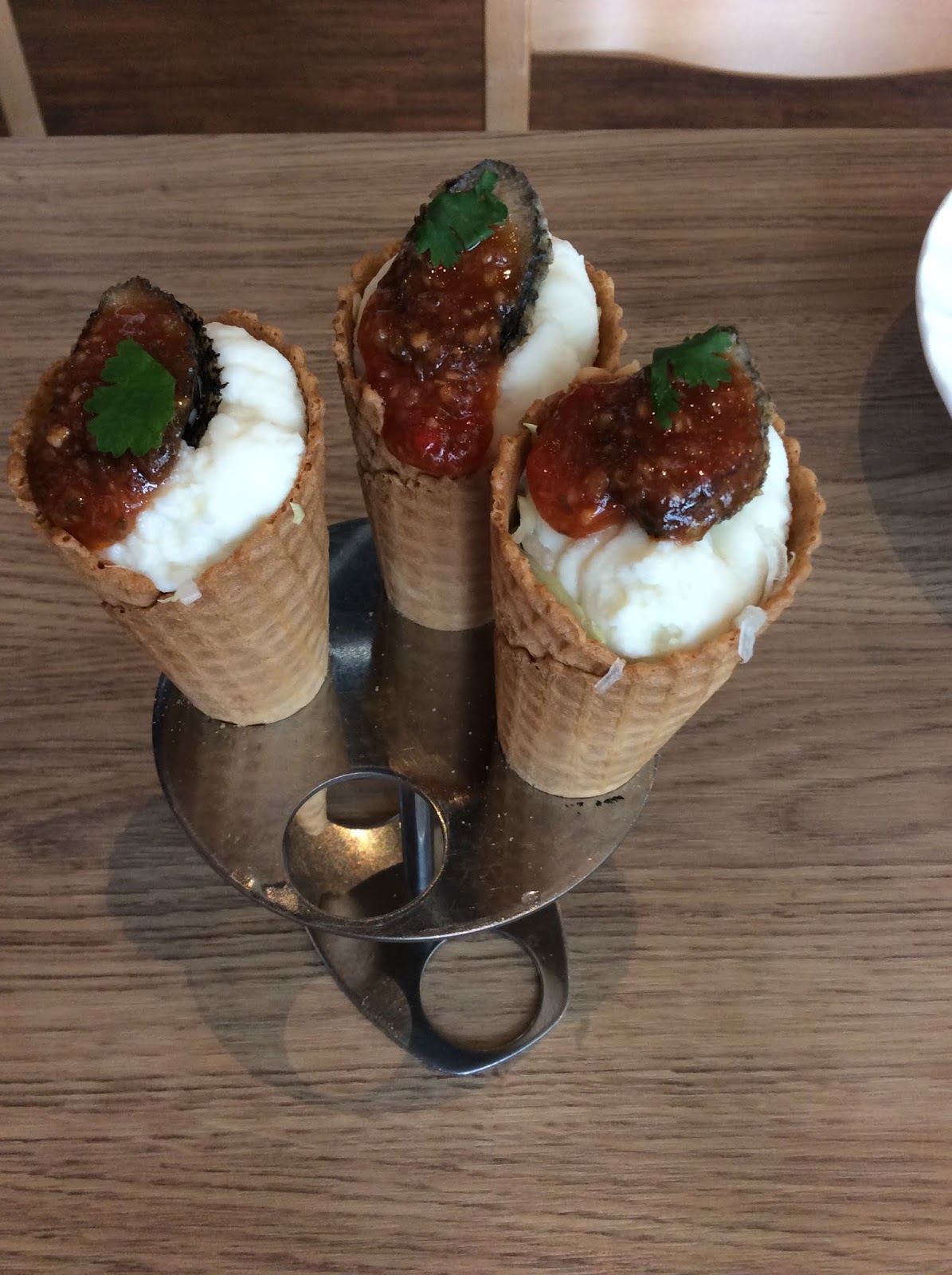 九孔鮑淋上五味醬,擺放在馬鈴薯泥的頂端,小朋友看了