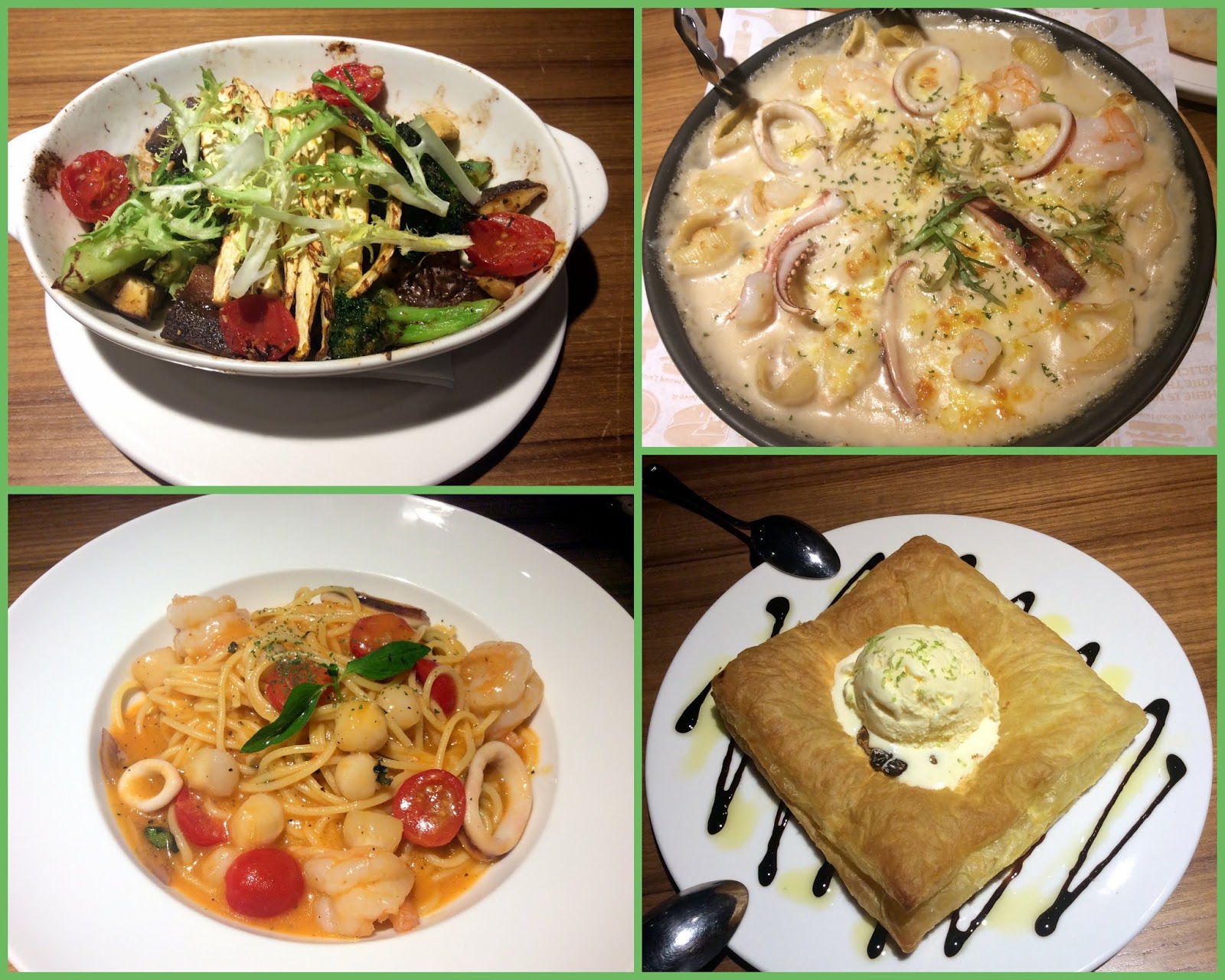 餐點有-比薩、溫野菜、義大利麵、圓頂海鮮、甜點和飲料,